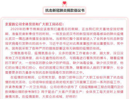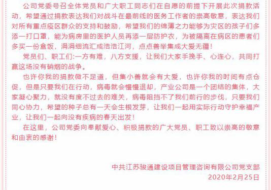 同時(shí)公司黨支部倡議,全體職工黨員向醫護人員捐款,所得款項按比例依次捐獻給省紅十字會(huì )和支付寶為因公參加2020抗擊新型肺炎工作員致殘或殉職的家屬所設立的“守護者后盾行動(dòng)基金”,以此表達駿通人對戰斗在最前線(xiàn)的醫務(wù)工作者的崇高敬意。