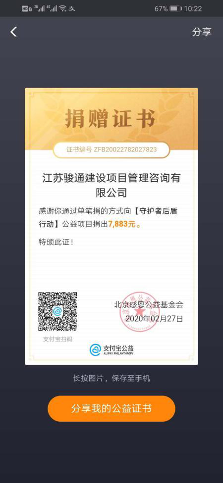 圖:支付寶公益基金會(huì )捐贈證書(shū)